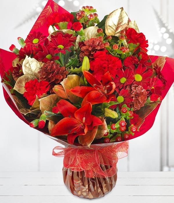 A festive collection of blooms come together to create this Berry & Bright bouquet, with deep red and glistening gold tones adding to the magic of Christmas.