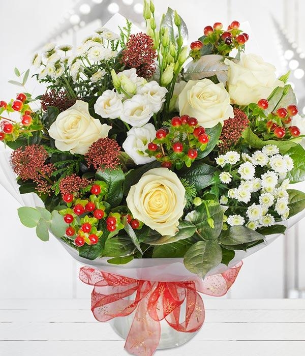 A Christmas arrangement that is sure to spread cheer. With crisp white roses, white chrysanthemums and hypericum berries combining beautifully to create this festive bouquet.