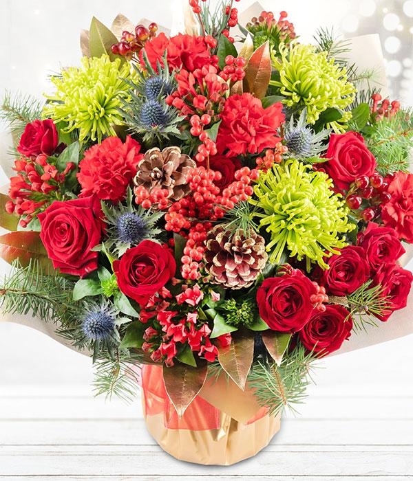 A hand-wrapped bouquet made up of deep red roses, carnations, and berries, decorated with festive pine and foliage.