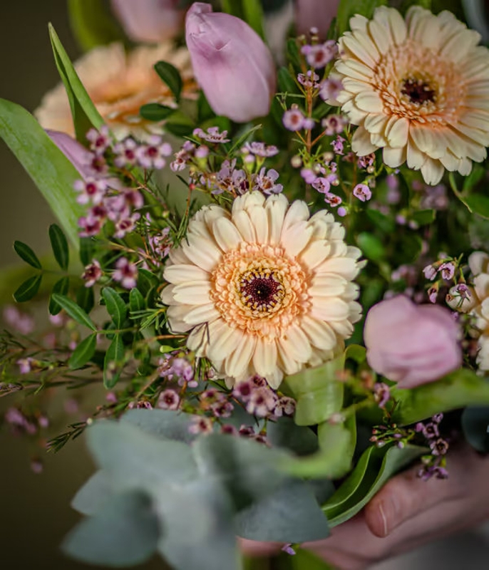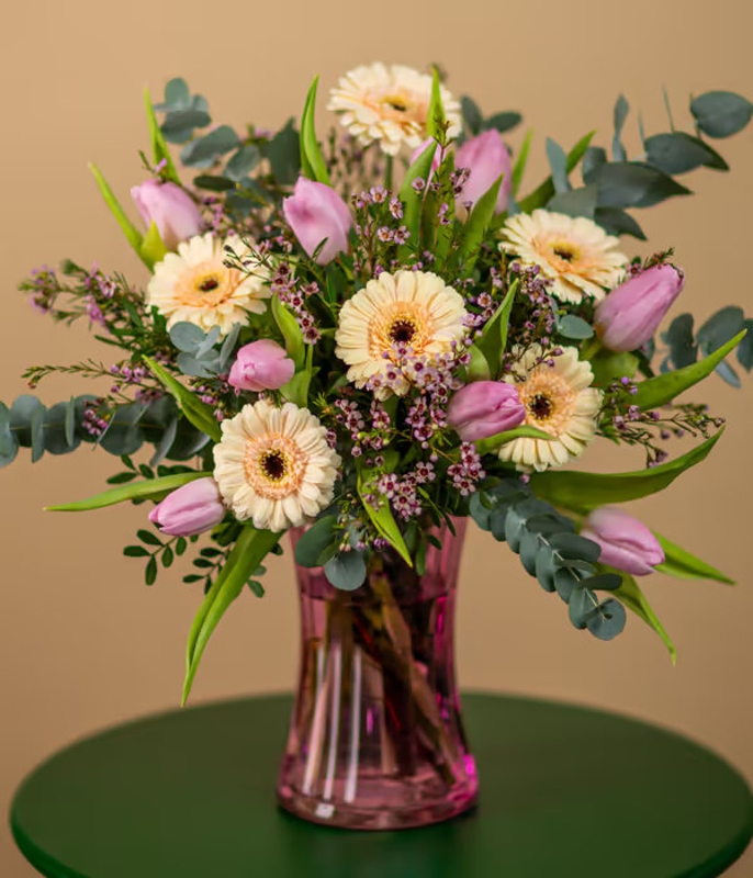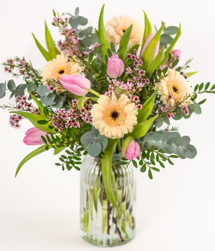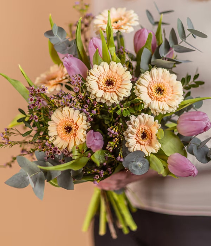 There's nothing quite like a mother's love. This beautiful florist bouquet features pink tulips, peach germini, and stunning seasonal foliage. A heartfelt gesture and an unbeatable price.